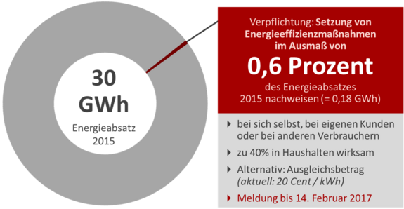 Hat ein Energielieferant im Jahr 2015 beispielsweise 30 GWh an Endenergieverbraucher abgesetzt, so ist er verpflichtet, im Jahr 2016 die Umsetzung von Maßnahmen im Ausmaß von 0,18 GWh (0,6 Prozent von 30 GWh) nachzuweisen: